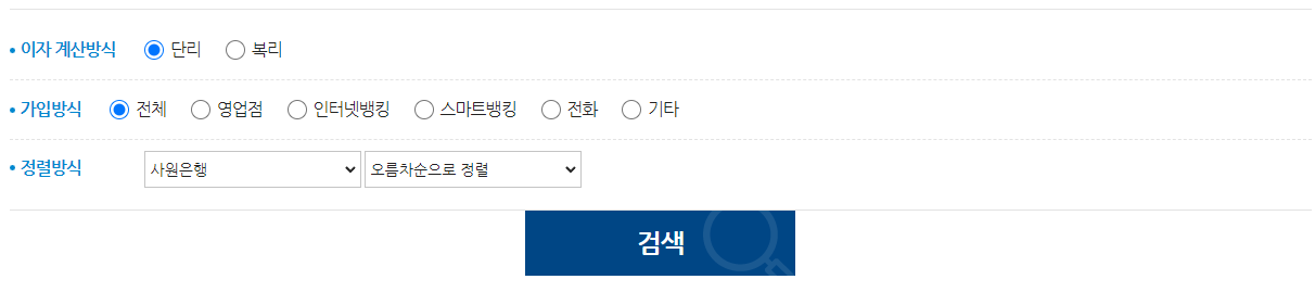 원하는 조건을 체크를 하고 검색을 하면 금리가 높은순으로 검색이 됩니다.