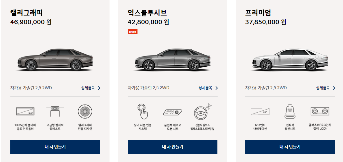 현대 그랜저는 프리미엄,익스클루시브, 캘리그래피를 포함해 여러 가지 트림으로 제공되며, 각각은 다양한 수준의 고급스러움, 편안함, 기술을 제공합니다. 세련된 드라이빙 체감을 제공하는 풀 사이즈 럭셔리 세단을 찾고 있다면 현대 그랜저를 고려해 볼 만합니다.