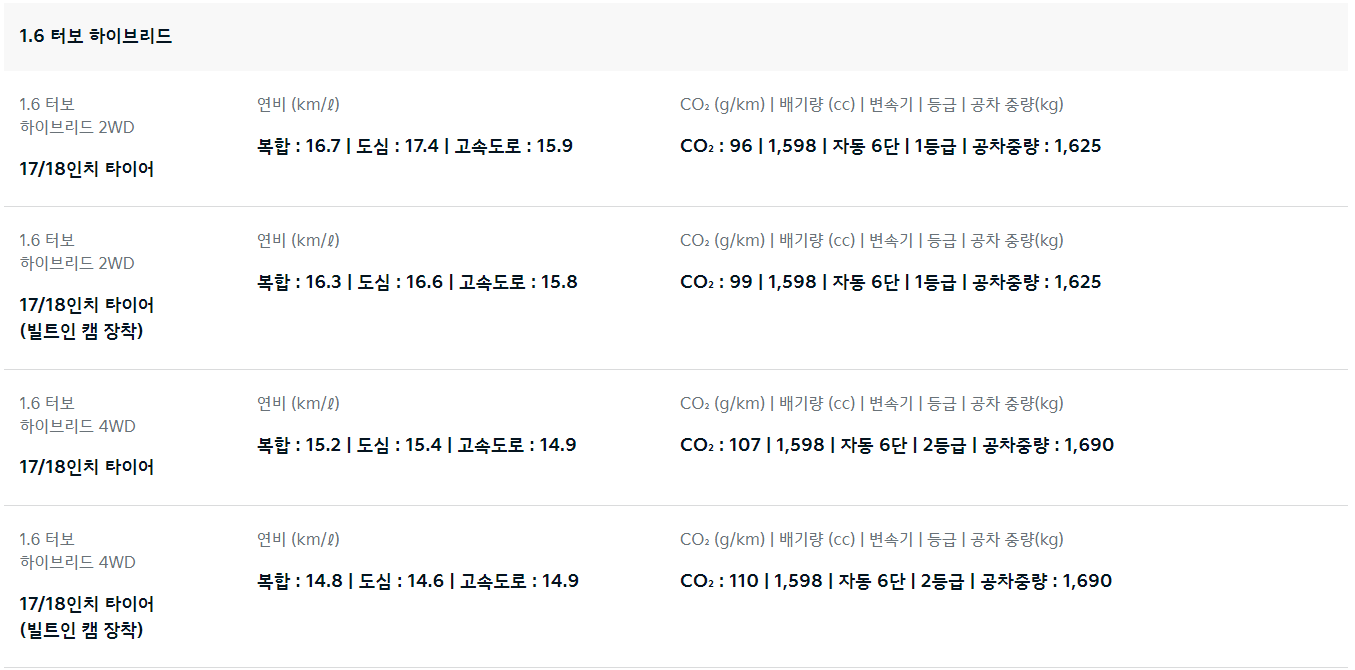 복합 15.2~16.7km/ℓ 도심 15.4~17.4, 고속 14.9~15.9