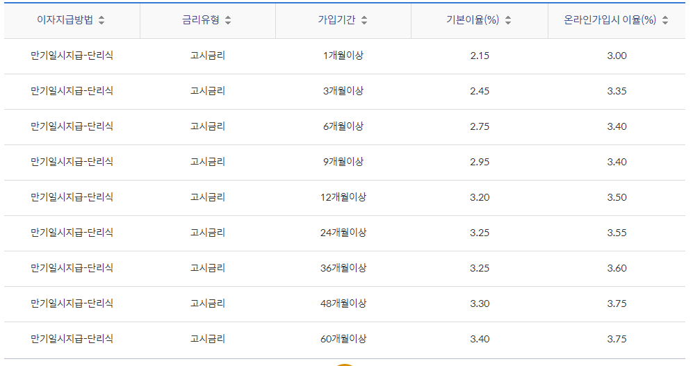 | 기본이자율 가입일(재예치일) 당시 영업점 또는 홈페이지에 고시된 ‘정기예금'의 고시이자율을 적용 |