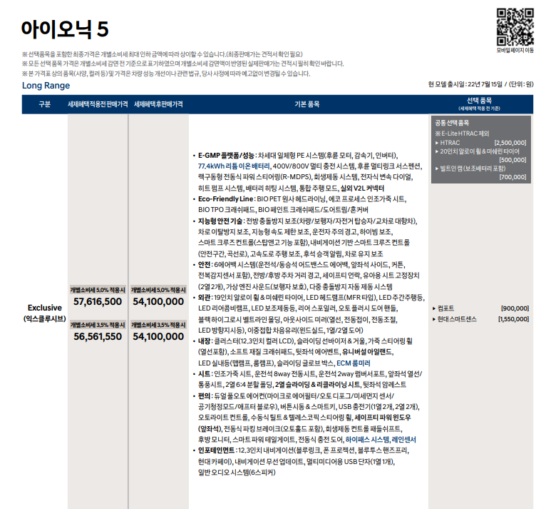 | Exclusive (익스클루시브) 세제혜택 적용 전 판매가격 57,616,500 세제혜택 후 판매가격 54,100,000 세제혜택 적용 전 판매가격 (개소세 3.5%) 56,561,550 세제혜택 후 판매가격 (개소세 3.5%) 54,100,000 |