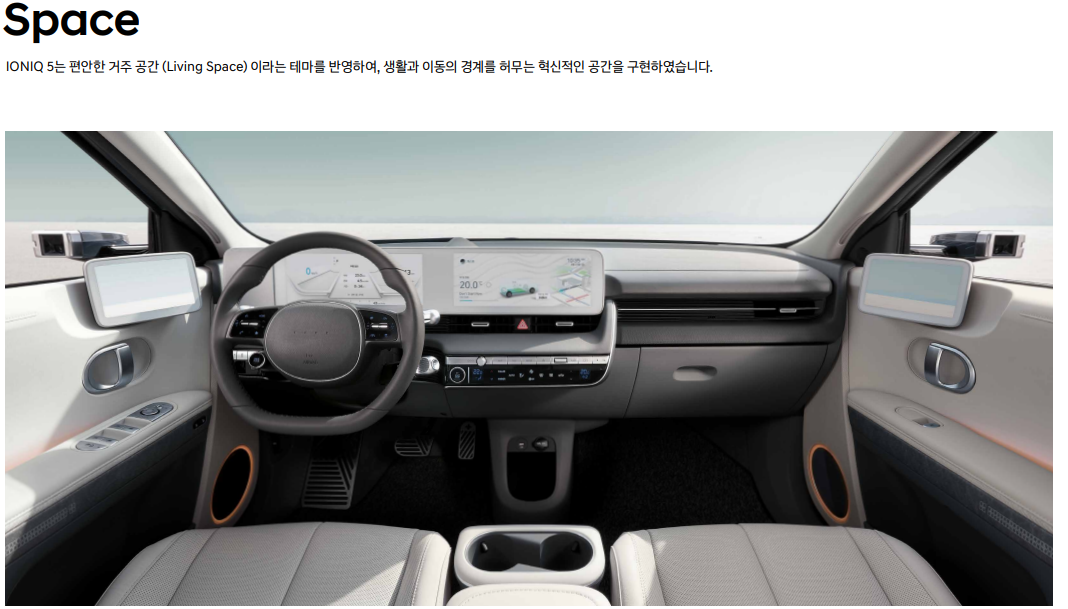 아이오닉5의 외관은 곡선과 직선의 조화로 이루어진 디자인으로, 현대차의 디자인 요소인 파라볼릭 라인이 적용되어 세련되면서도 독특한 느낌을 줍니다. 내부는 넓은 공간과 세련된 디자인, 그리고 최신 기술이 잘 접목된 형태로 구성되어 있습니다. 더불어 기어 레버와 스티어링휠은 더욱 세련된 느낌을 줍니다.