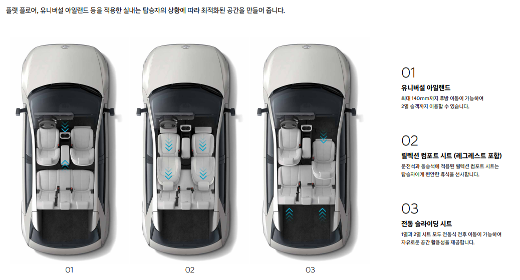 인조가죽 시트, 운전석 8way 전동시트, 운전석 2way 럼버서포트, 앞좌석 열선/통풍시트, 2열 6:4 분할 폴딩, 2열 슬라이딩 & 리클라이닝 시트, 뒷좌석 암레스트